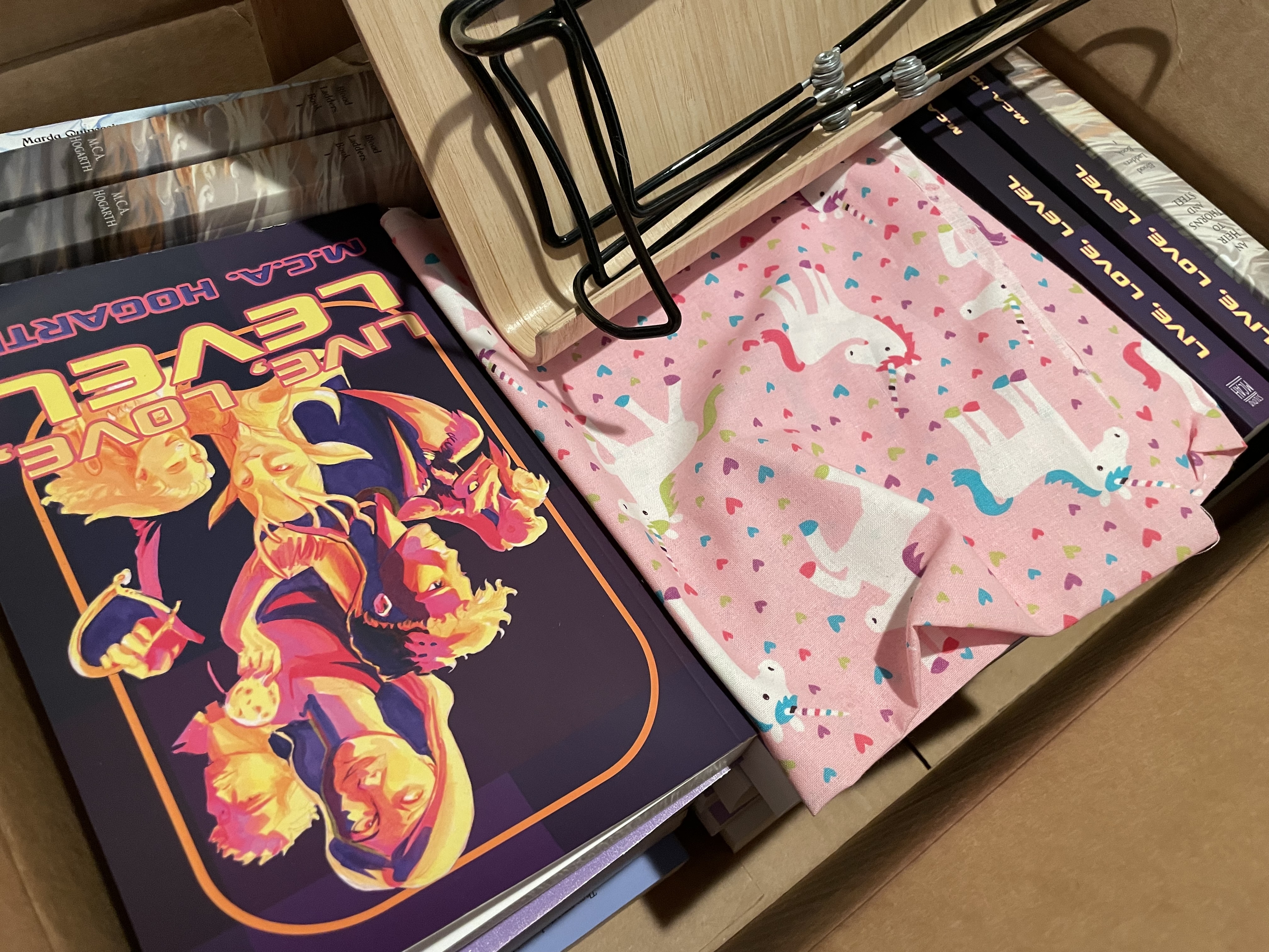 Last year, as some of you might remember, I tried selling books in the mall in a store devoted to local merchants. I was committed to that contract for twelve months, during which I sold maybe 14 books? I need to doublecheck. It was more than I expected but fewer than I needed to make that venture profitable, so I canceled my lease and called it a useful adventure. Which it was! But anyway, to furnish my area properly, I had to buy a lot of stock and I don’t really want it lying around, particularly since some of them have some imperfections after leaning on a store bookshelf for months. The obvious solution is a discounted doodled-in books sale! More on that after I do a product count.